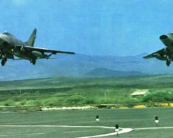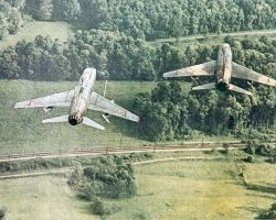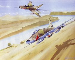 North American F-100 D – Décollage en patrrouille de Djibouti – Photo publiée sur Le Fana de l’Aviation n° 284 – Juillet 1993 – (Coll. P. Lebrun) –